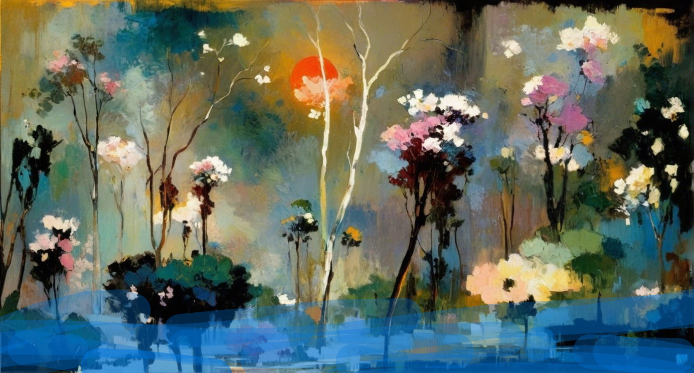 A vibrant, abstract landscape featuring colorful flowers and tall trees reflected in a shimmering body of water, illuminated by a bright sun and soft clouds in a rich, textured sky.