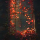 A rustic stone window framed by vibrant red leaves. Sunlight filters through, casting warm tones inside. The scene evokes a peaceful autumn atmosphere, blending nature with architecture.