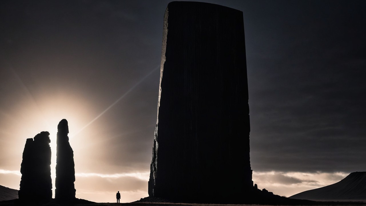 A solitary figure stands near towering stone monoliths against a dramatic sunset. Dark clouds frame the scene, creating an atmosphere of mystique and ancient history.
