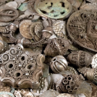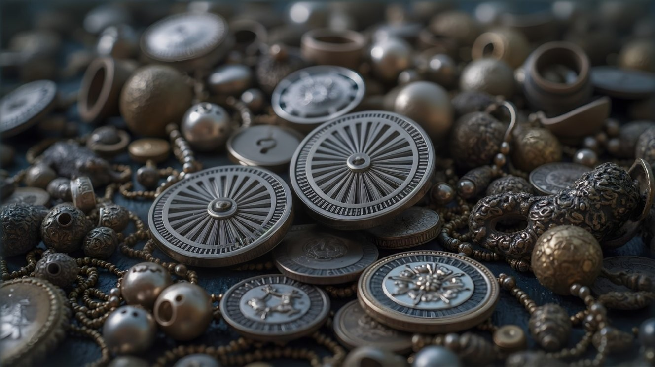 The image features a collection of intricate metallic objects, including coins, buttons, and orbs, showcasing detailed engravings and various textures, all artfully arranged on a wooden surface.