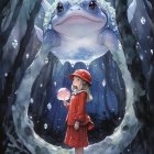 A mystical scene features a young girl with silver hair surrounded by a dark forest. Droplets and crystals hang around her, while a small frog sits on a mossy ground amidst glowing mushrooms.