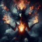 Mystical figure in water with flames and smoke