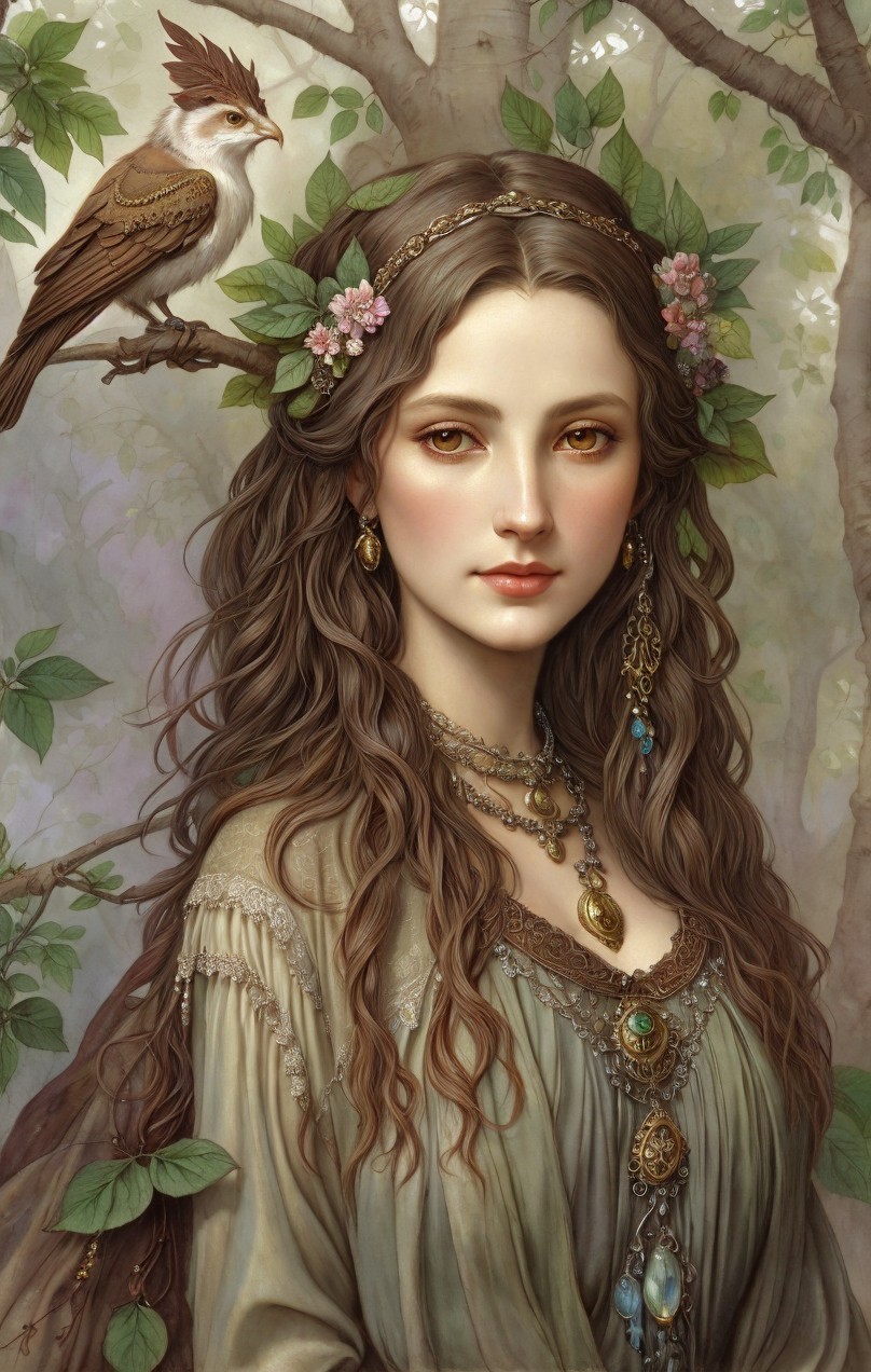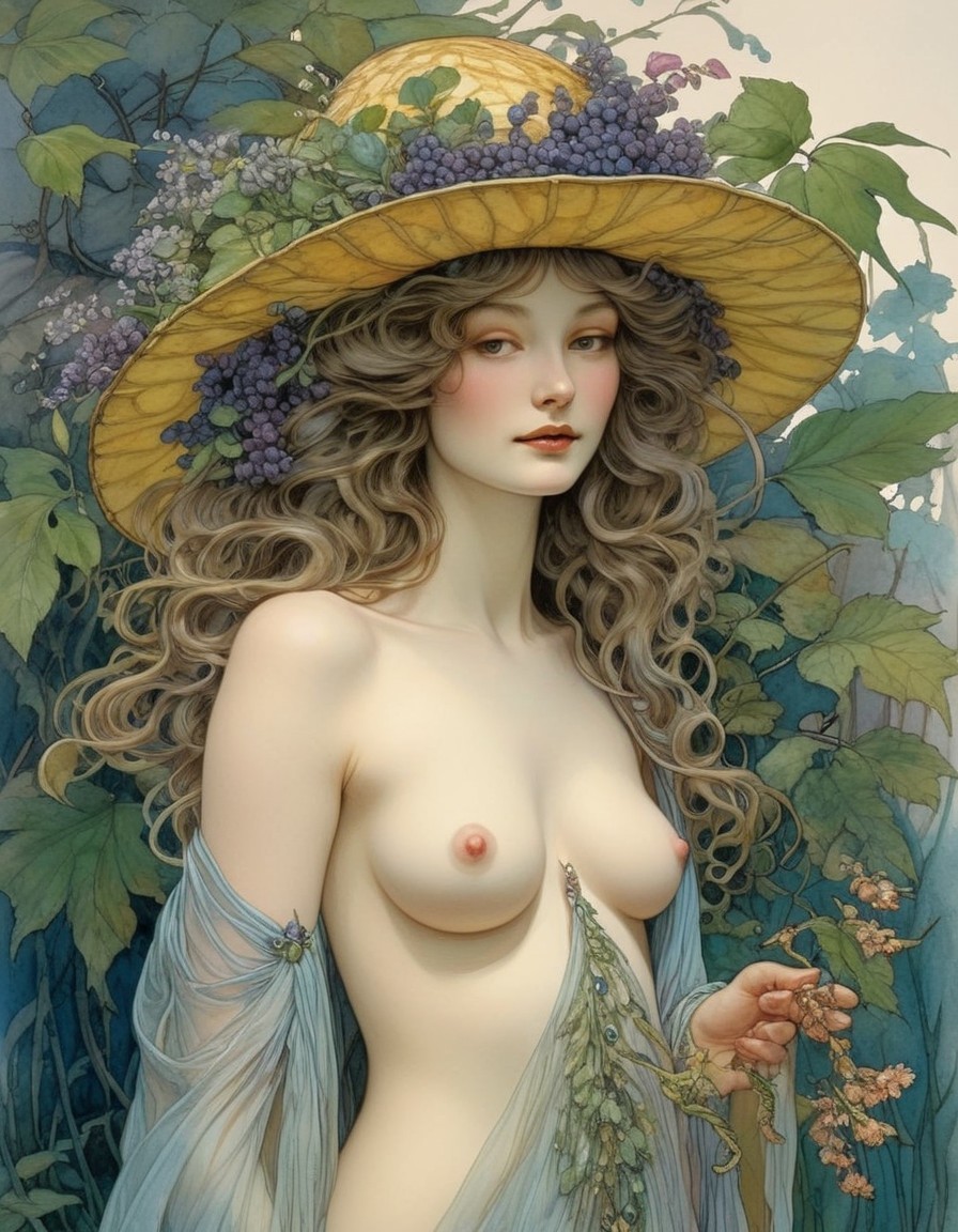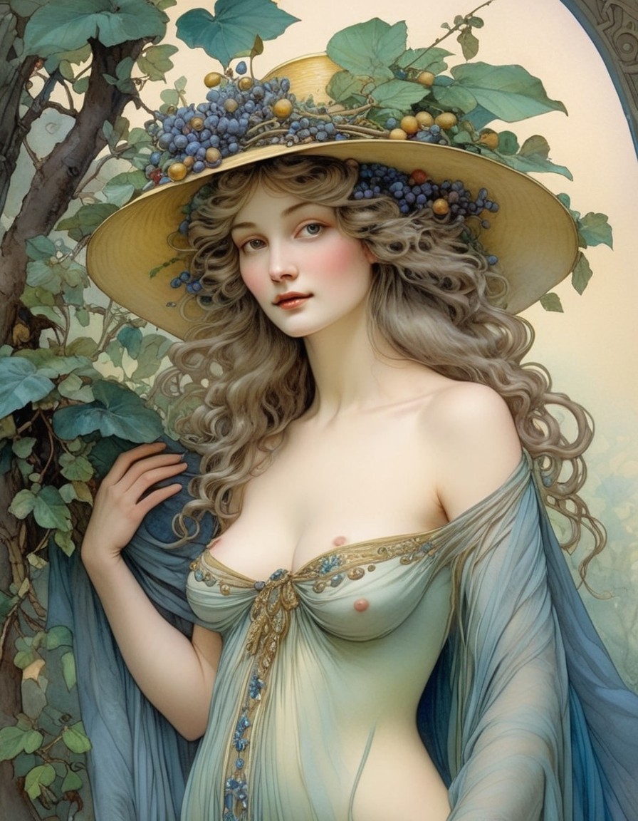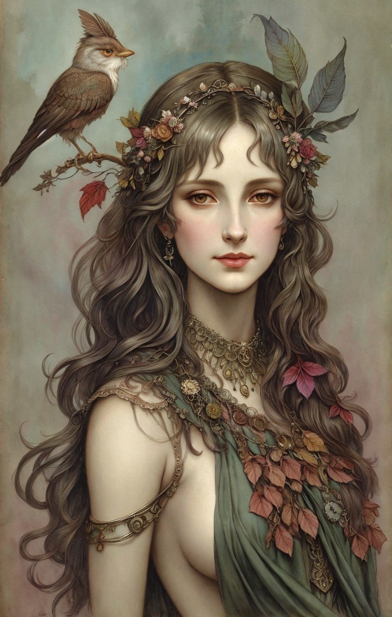 Iridescent gown. Morea is the name of another female dryad that lives on mulberry trees.Dryad priestess in flowing shawls, colored ink drawing, watercolor artwork on old withered paper, vintage, by Caravaggio, Fragonard, Anton Pieck, pale colors, high detail, intricately detailed, hyperdetailed volumetric lighting, art nouveau graphic steampunkwhimsical, beautiful, poignant, touching. colors rose, gold, rust, burgundy, black. soft watercolor extra water in Art Deco by Annigoni, Egon Schiele, Milo Manara, Botticelli, Catrin Welz-Stein, Jean Metzinger, Klimt, perfect eyes, perfect handsface, highly detailed, complementary colors, hyper detailed. Watercolor and ink splatter, dynamic pose, dark blue background, unreal engine, greg rutkowski, loish, rhads, beeple, makoto shinkai and lois van baarle, ilya kuvshinov, rossdraws, tom bagshaw, alphonse mucha, global illumination, detailed and intricate environment Modifiers:dramatic Van Gogh Arthur Rackham Gothic Paul Klee pen and ink dreamy anatomically correct Edward Gorey disturbing metallic colors forboding Esao Andrews biomorphic hallucinatory DZO:Olivier Dorota Piotrowiak