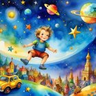 A whimsical scene features a joyful boy in a blue shirt and yellow socks, floating above a colorful landscape with planets, stars, an angel, and a charming castle, set against a glowing moon.