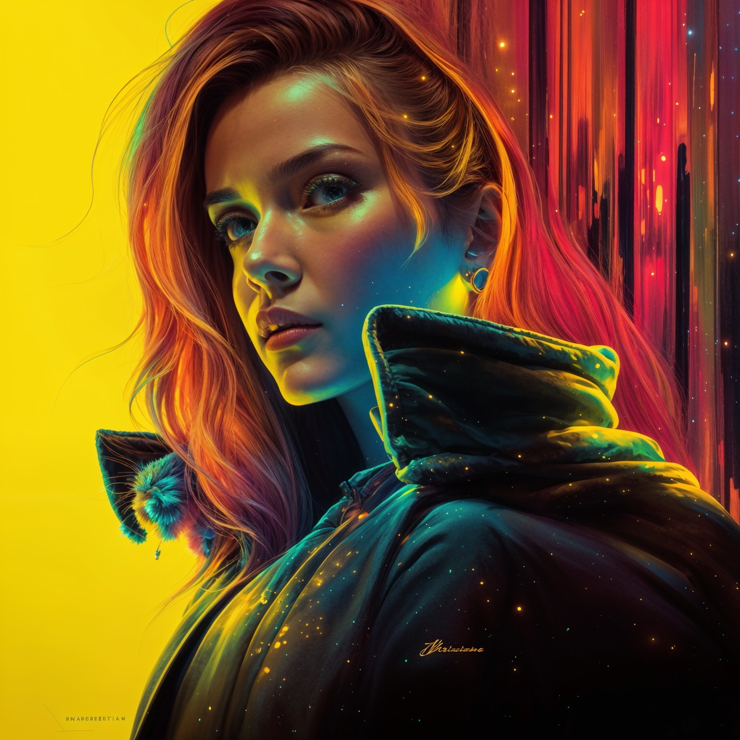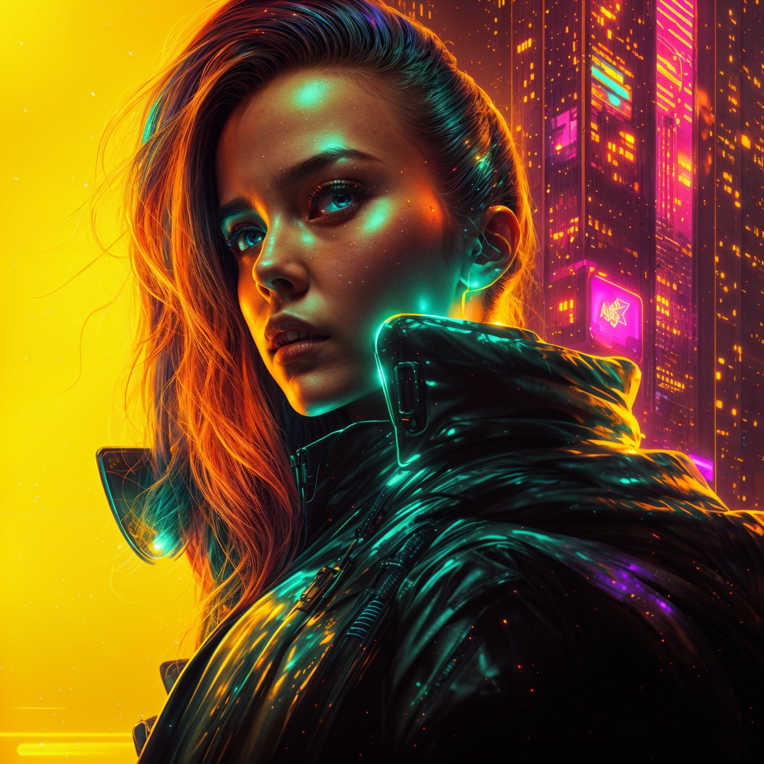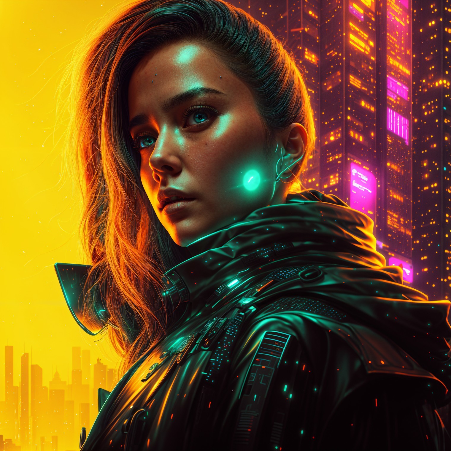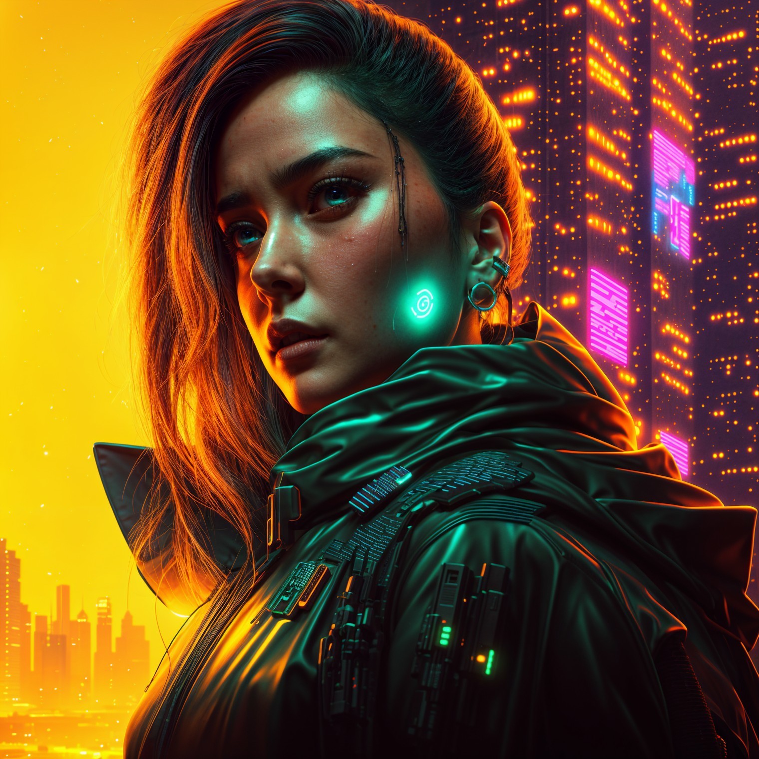 A cyberpunk woman stands against a vibrant cityscape, illuminated by neon lights. She has futuristic accessories, including glowing earrings and a sleek, high-tech jacket, exuding confidence.