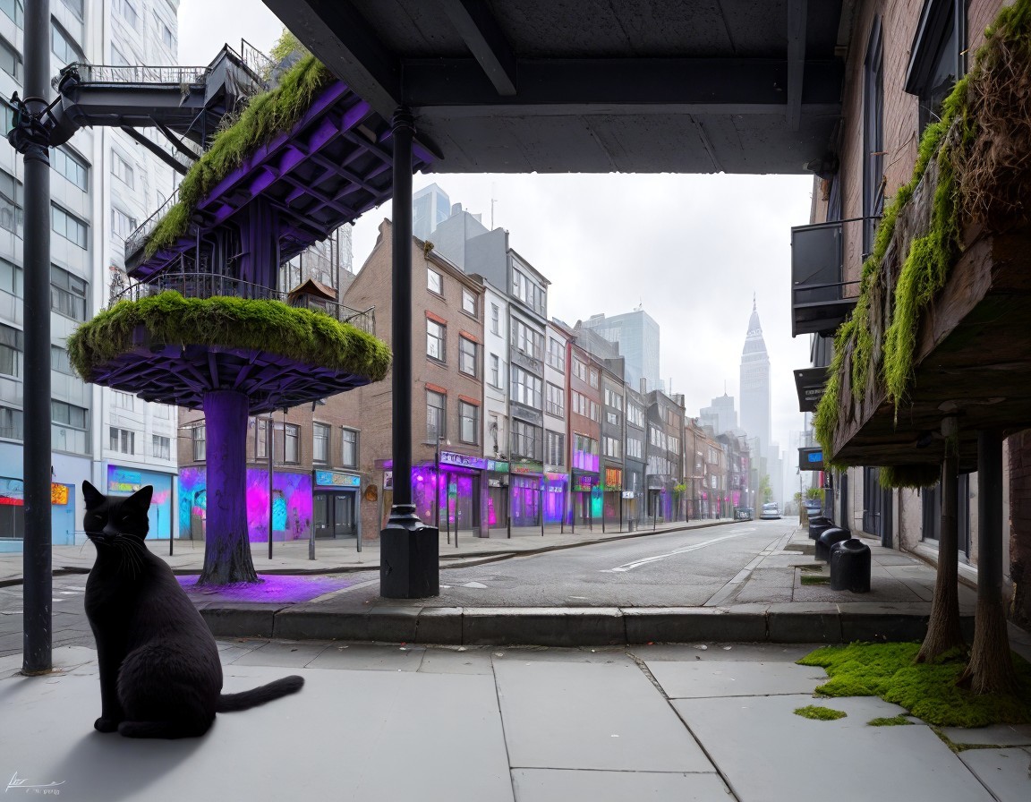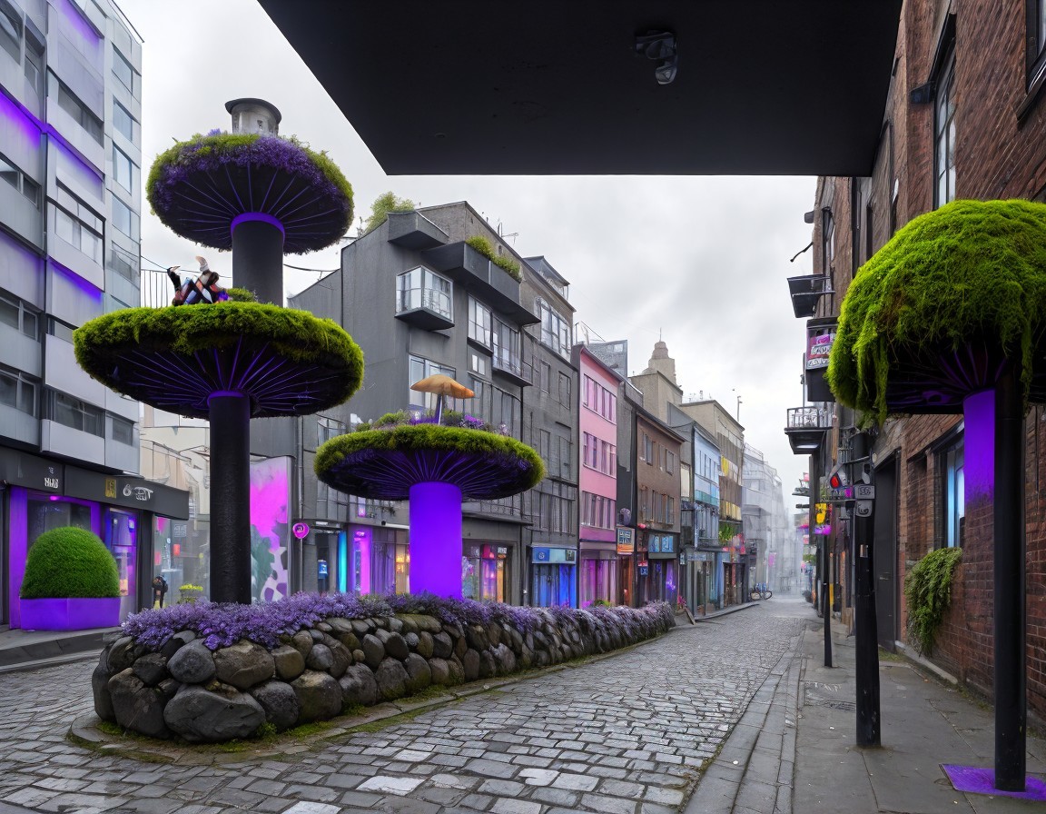 Magical mushrooms and moss are growing on the stones. Vibrant blue and violet lights dance in the street like fireflies. The city is being overrun by the forest. Plant life is blossoming everywhere. Colorful flowers adorn the vines on the trees. Luminous lights of multicolors dance in the sky.