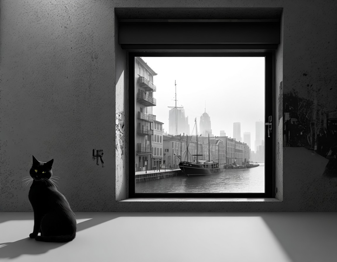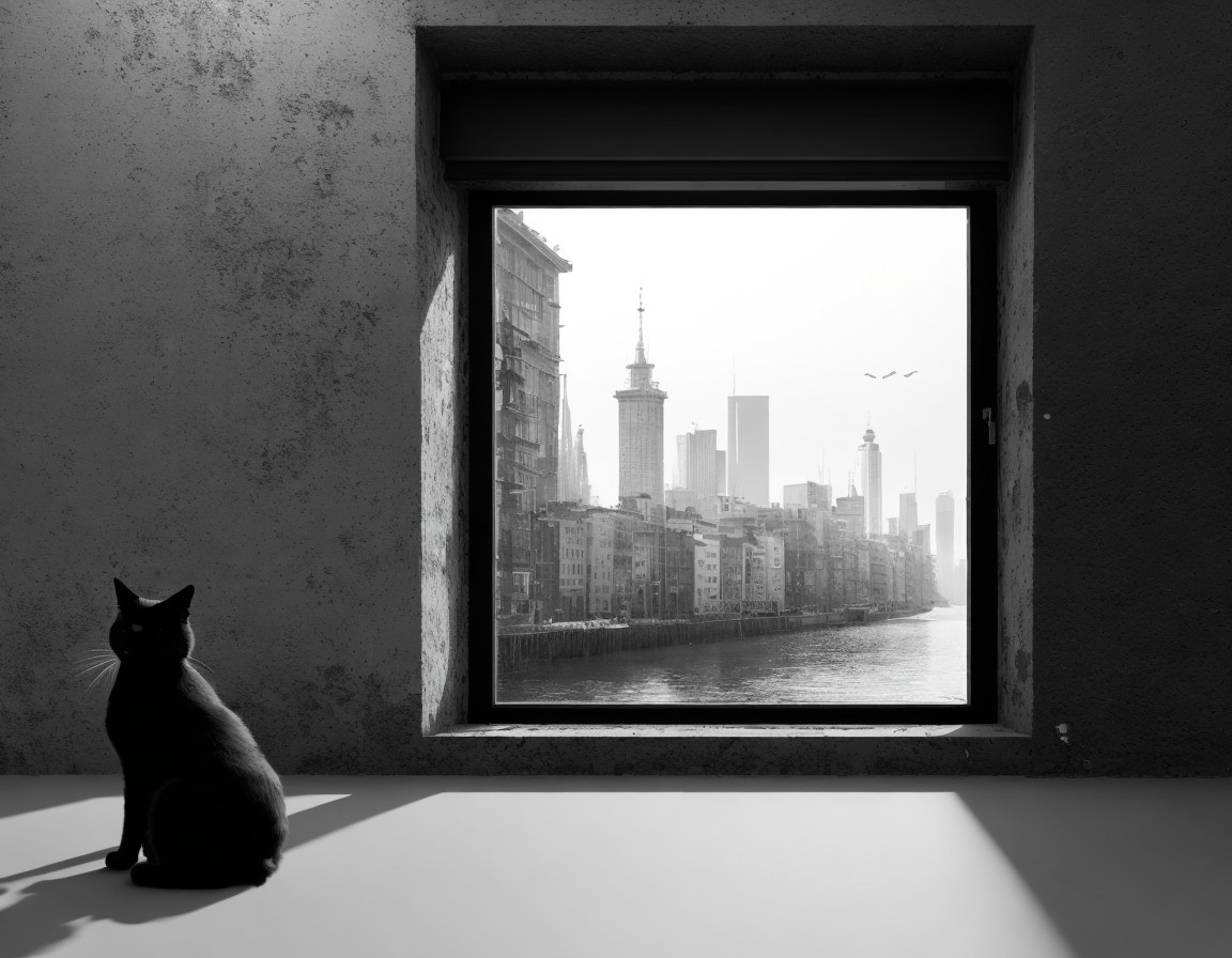 Prompt: "A 3D rendering of a cat sitting on a windowsill in minimalist style with high resolution.