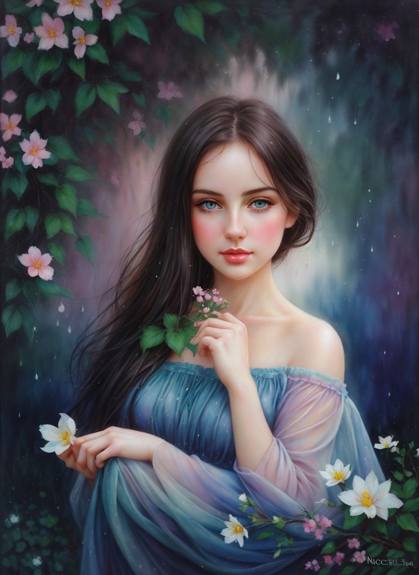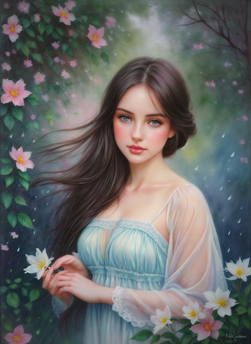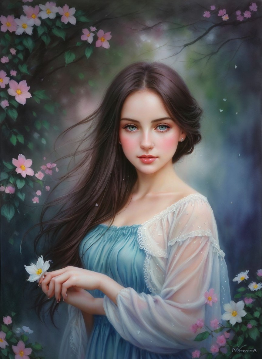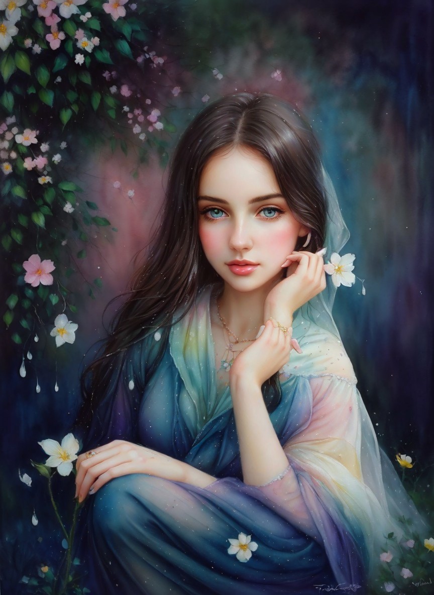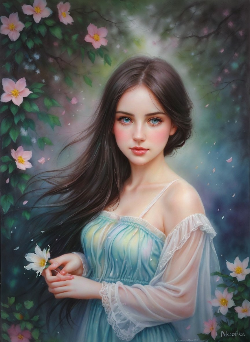+ Prompt:delicate pastel watercolour painting of a stunningly beautiful young woman with perfect eyes and perfect mouth and milky skin and very wild pretty dark tresses dotted with flowers, bold pastels in complimentary colours, impressionism, splash, droplets, fast brush strokes, wet on wet, by Nicoletta Ceccoli, by Tara McPherson, by Wendy Carlton, loose watercolor with drips, ultra soft colors, aquarelle