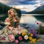 A serene scene depicts a woman in a flowing pink gown sitting by a tranquil lake, surrounded by colorful clouds and vibrant nature, as the sun sets behind majestic mountains.