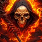 A skeletal figure in ornate armor, with a fierce skull face and glowing eyes, wields flames amidst a mysterious, shadowy environment filled with ancient ruins. The atmosphere is intense and captivating.