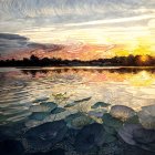 A serene watercolor scene captures a sunset over a tranquil lake, reflecting vibrant colors. Water lilies float gently, surrounded by rippling water and a dramatic sky filled with clouds.