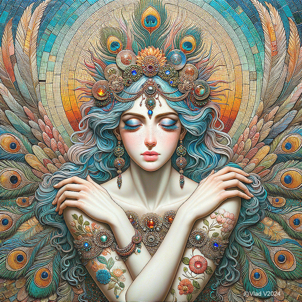 A vibrantly colored illustration of a woman with peacock feather motifs and intricate jewelry, exuding a mystical aura.