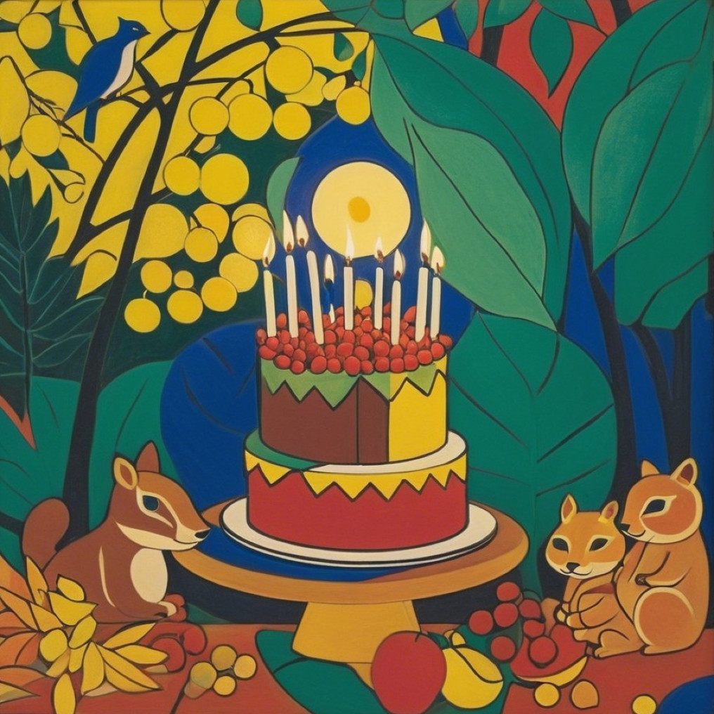 (squirrels playing in the trees, vibrant and deep foliage, bright green balances with golden yellows fall fruits, against cobalt and emerald foliage, coral blossoms glowing at the base) (a small bird gazes toward the full moon, evoking a sense of dialogue between earth and sky),