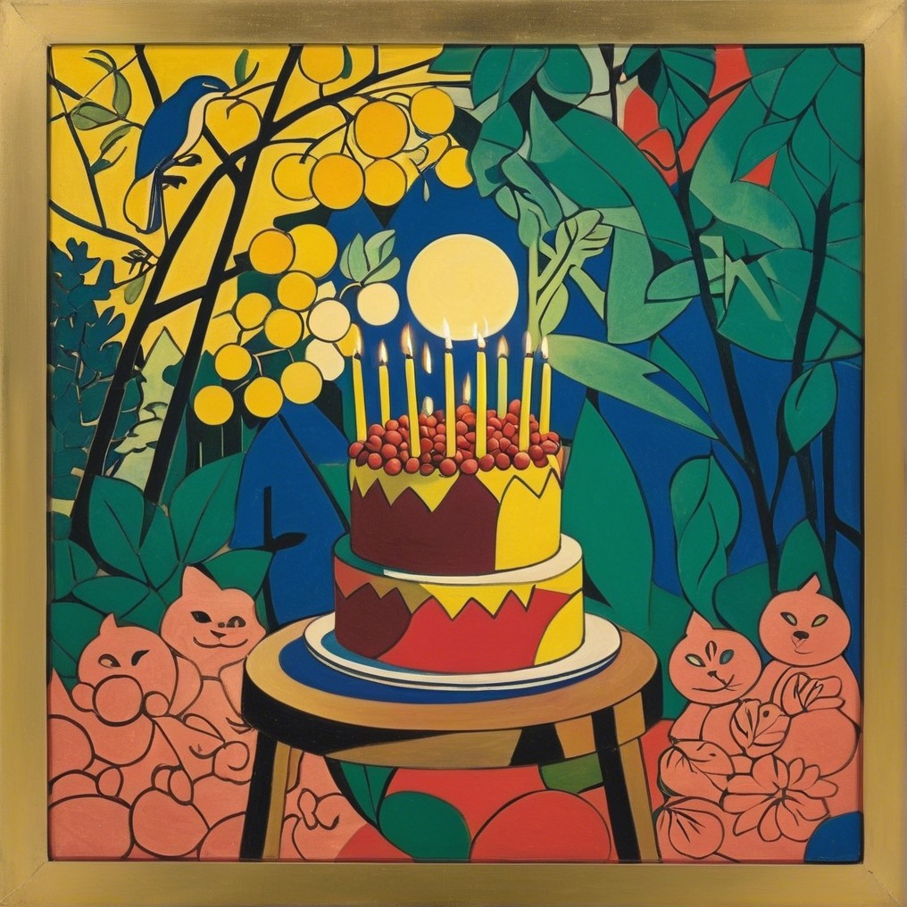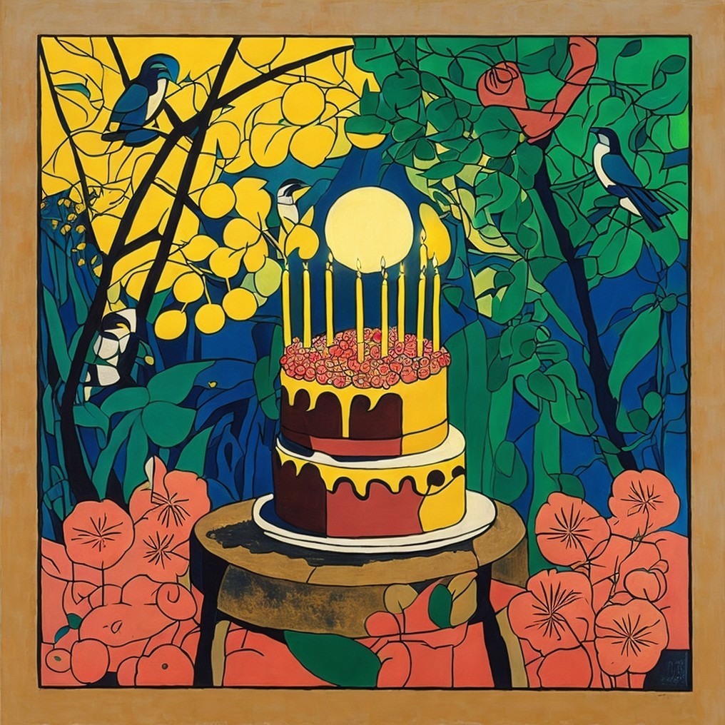 ((DOUBLE EXPOSITION WITH A SUPERB, GRET BIRTHDAY CAKE WITH LIGHTED CANDLES))