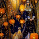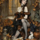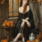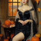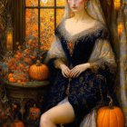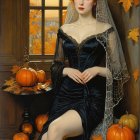 A woman in a dark blue dress sits among pumpkins and autumn leaves, framed by a window with a spiderweb. The warm hues of fall create a mystical, enchanting atmosphere.
