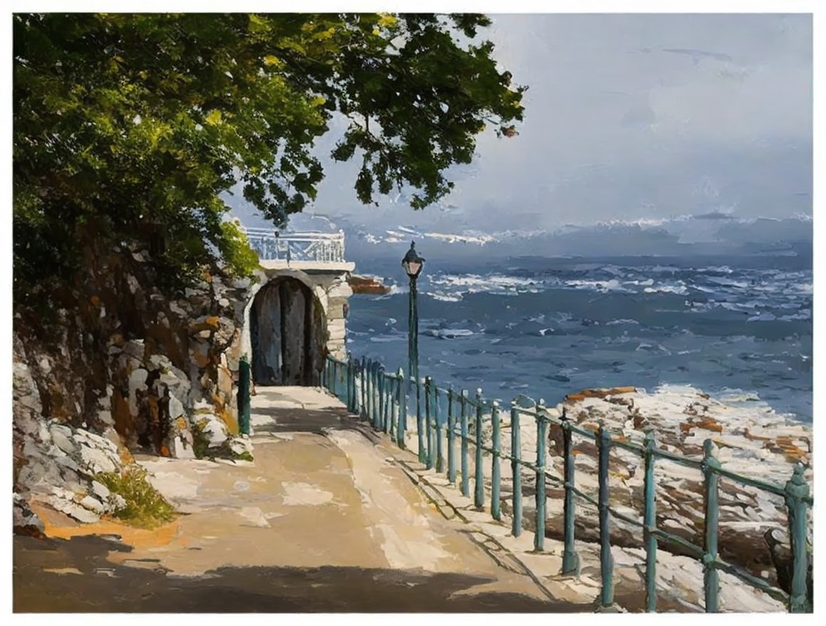 Seaside Pathway with Railing and Stone Archway
