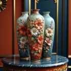 The image features three ornate vases on a marble table, adorned with floral designs. A stunning bouquet of white flowers adds elegance, set against a richly decorated blue wall.