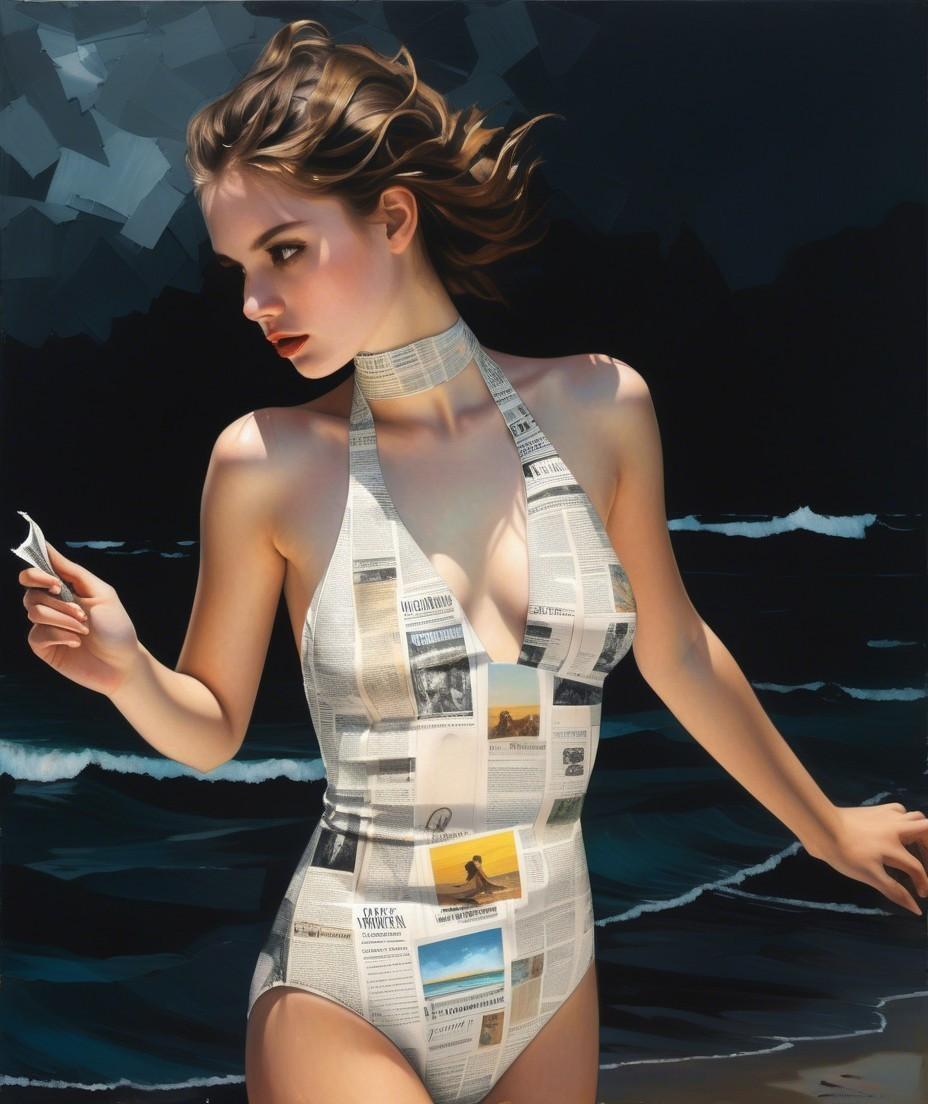 A stunning surrealist painting by Gauguin featuring a girl at the beach wearing a swimsuit made entirely of newspapers. The girl has a mesmerizing expression, with her her hair a wild cascade of crumpled newsprint