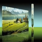 A surreal landscape features a dramatic backdrop of clouds and rolling hills, with a serene village, two horses, and distant sailing boats, all framed by an abstract vertical pillar.