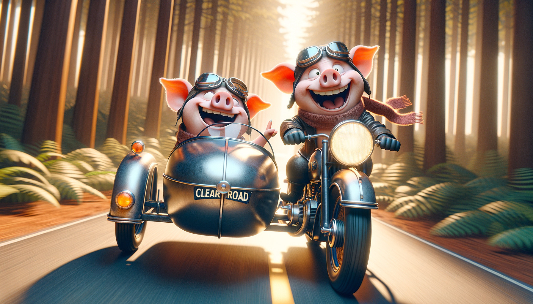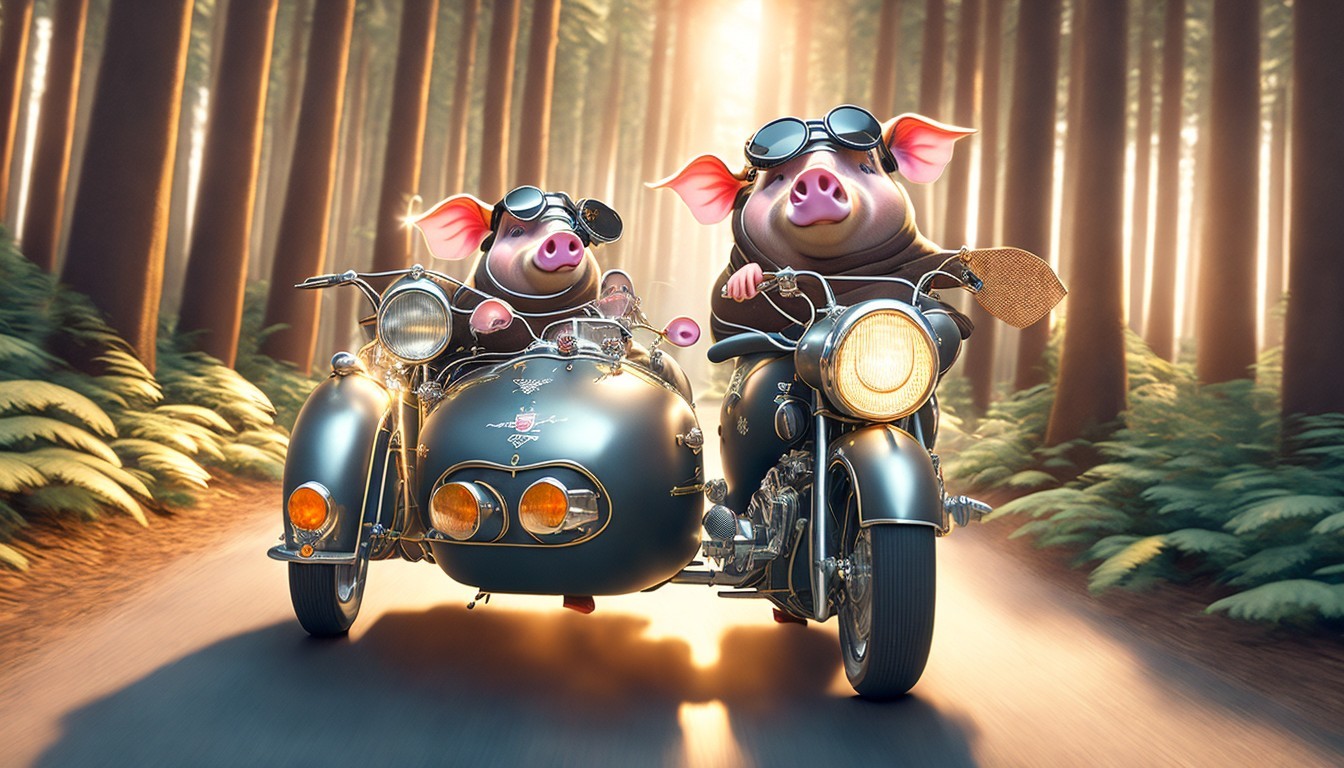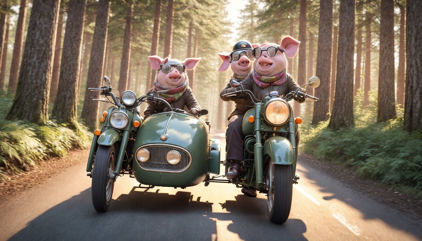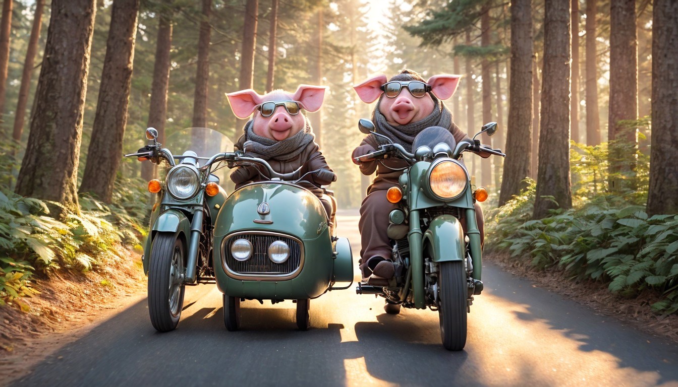 Two animated pigs wearing goggles ride motorcycles in a sunlit forest.