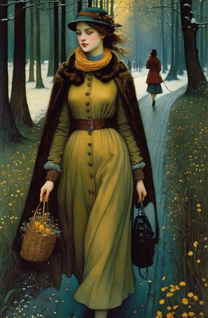 + Prompt:Upon that wintry day, amid the brown wands of the wide avenue, the girl on her walk appeared to have kept something of the summertime about her - as if her soul were a bright firefly.