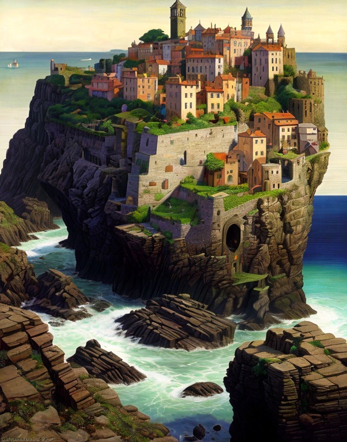 Prompt: "Geomtric industrial stunning fishing village, geometric,Picasso rocky shore, by dante gabriel rossetti, donatello, Highly Detailed, Fantasy style, Magical, Illusion, Surreal, Artwork, Highly detailed, Concept art, Surrealism, Surreal art, Artstation, Salvador Dali, Fantasy adrian tomine, alan lee, alex timmermans, atey ghailan, arshile gorky, brian kesinger, brothers hildebrandt, brian froud, bruce pennington"