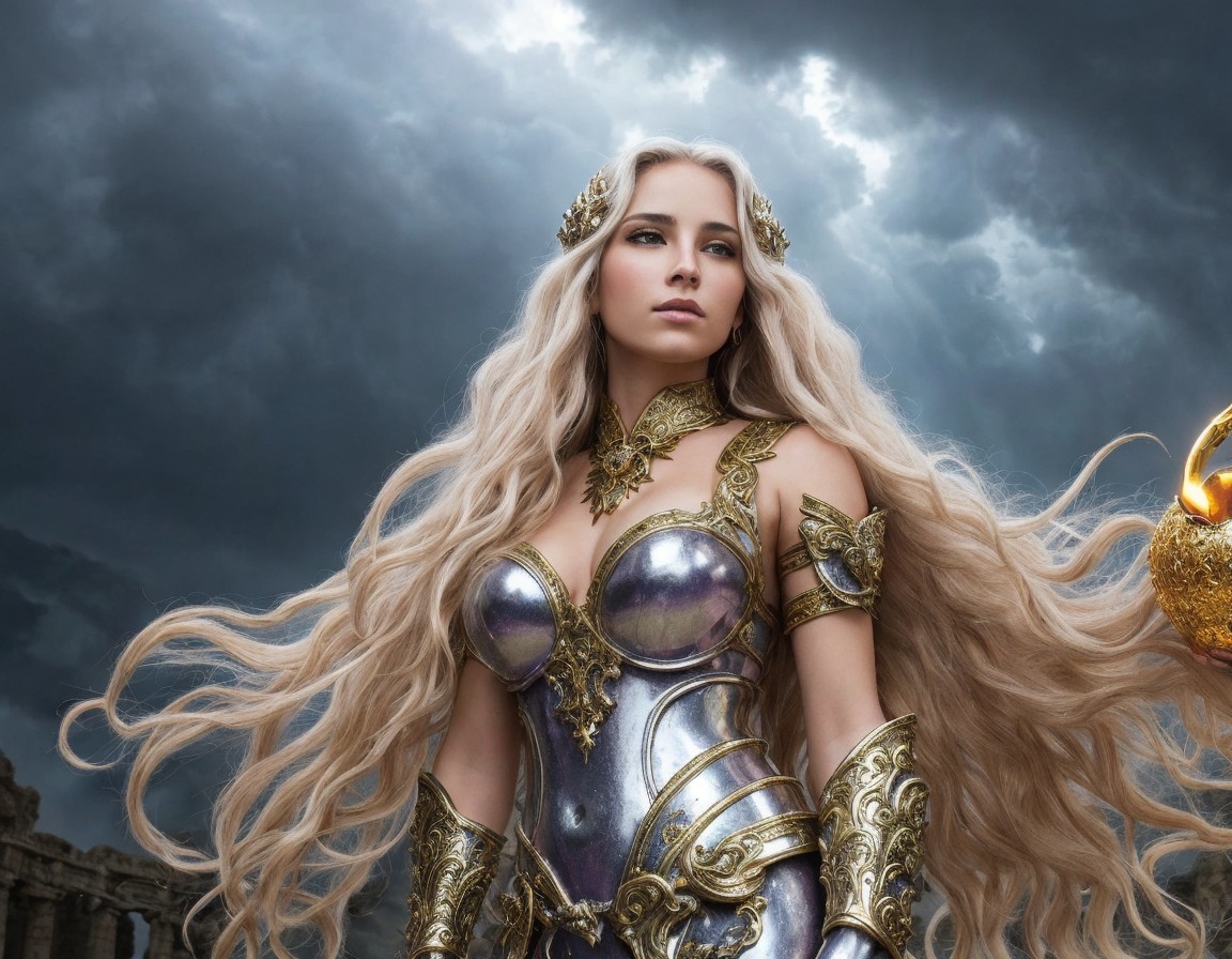Radiant goddess with flowing golden hair, adorned in shimmering silver armor, holding a gleaming golden apple, surrounded by swirling chaos and discord, mythical setting with ancient ruins, dramatic clouds in the sky, ethereal and mystical atmosphere, intricate details on the armor and accessories, dynamic pose exuding power and mystery, vibrant colors of gold, silver, and deep purple, divine lighting casting dramatic shadows, a blend of classical and fantasy elements, digital painting, high resolution for intricate details, inspired by classical mythology and fantasy art, ArtStation showcase.