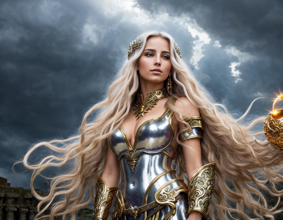 Prompt: "Radiant goddess with flowing golden hair, adorned in shimmering silver armor, holding a gleaming golden apple, surrounded by swirling chaos and discord, mythical setting with ancient ruins, dramatic clouds in the sky, ethereal and mystical atmosphere, intricate details on the armor and accessories, dynamic pose exuding power and mystery, vibrant colors of gold, silver, and deep purple, divine lighting casting dramatic shadows, a blend of classical and fantasy elements, digital painting, high resolution for intricate details, inspired by classical mythology and fantasy art, ArtStation showcase."