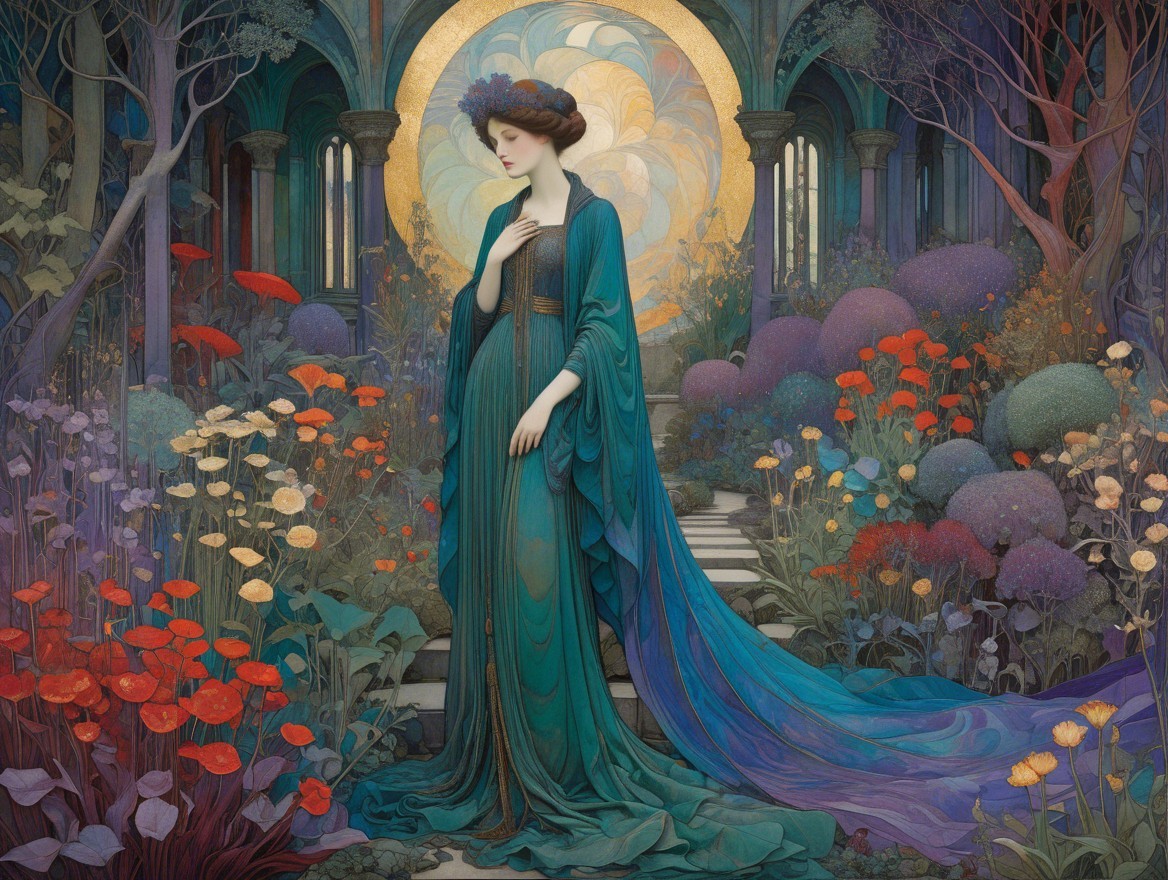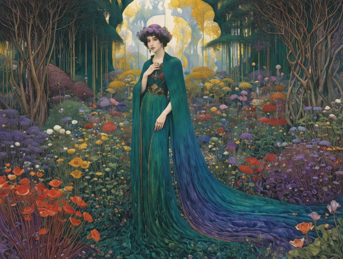 A serene woman in a flowing teal gown stands amidst vibrant flowers and ethereal foliage, framed by an archway leading to a mystical garden, exuding tranquility and beauty.