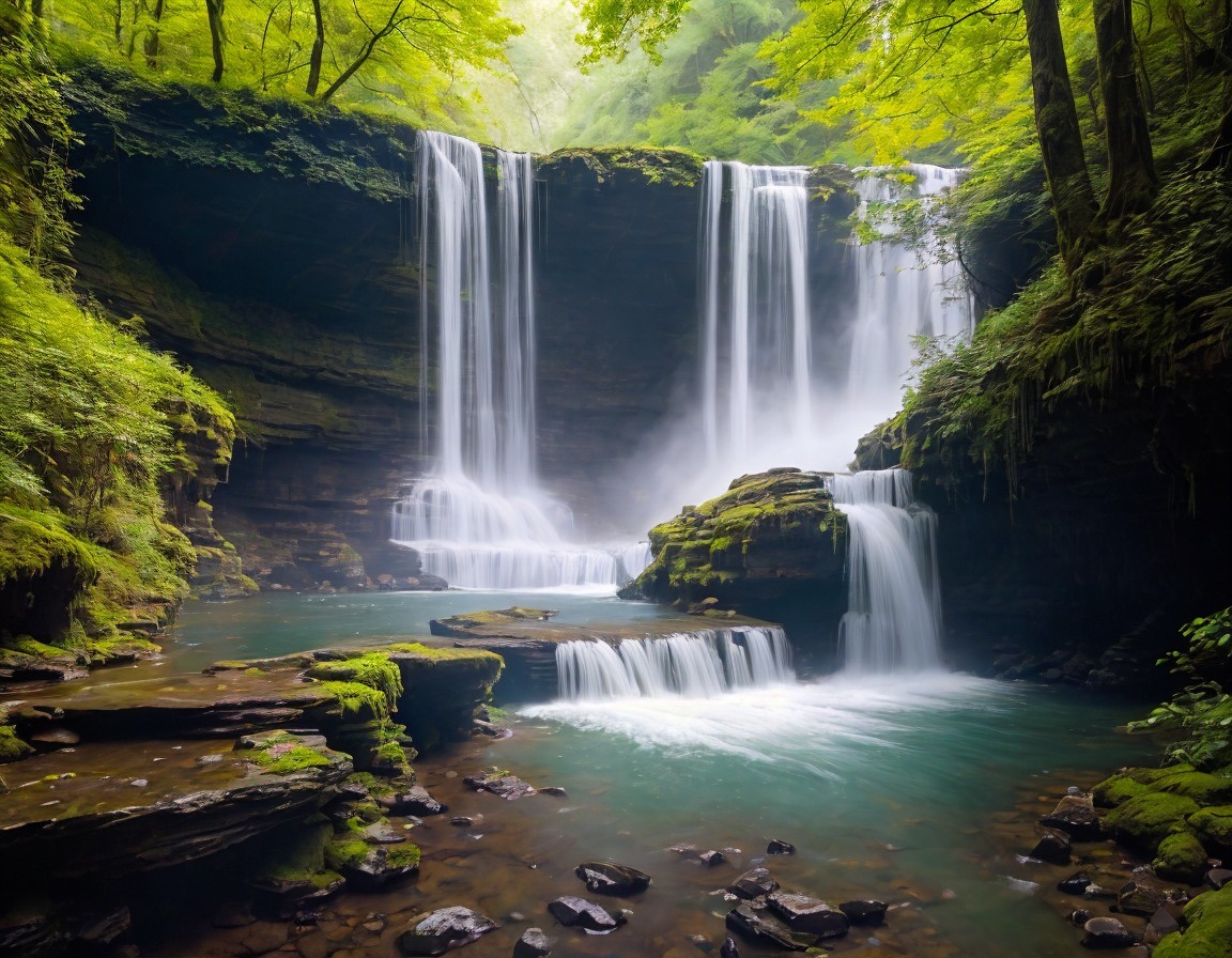 A serene landscape featuring cascading waterfalls surrounded by lush greenery, with smooth stone formations leading to a tranquil pool, creating a peaceful and enchanting natural setting.