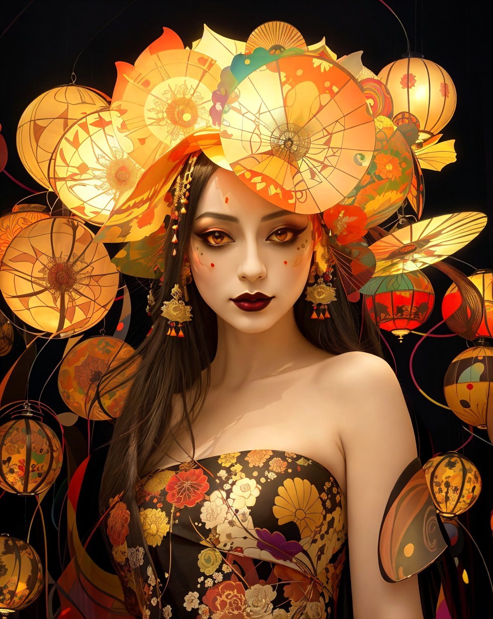 + Prompt:Abstract painting, in the style of gothic illustration, illusory wallpaper portraits, geisha portraiture, dark amber, abstract style of Kandinsky, Burton, Klee. The background is made of multi-coloured lanterns. Intricate, surreal, swirling. Vibrant, festive colours