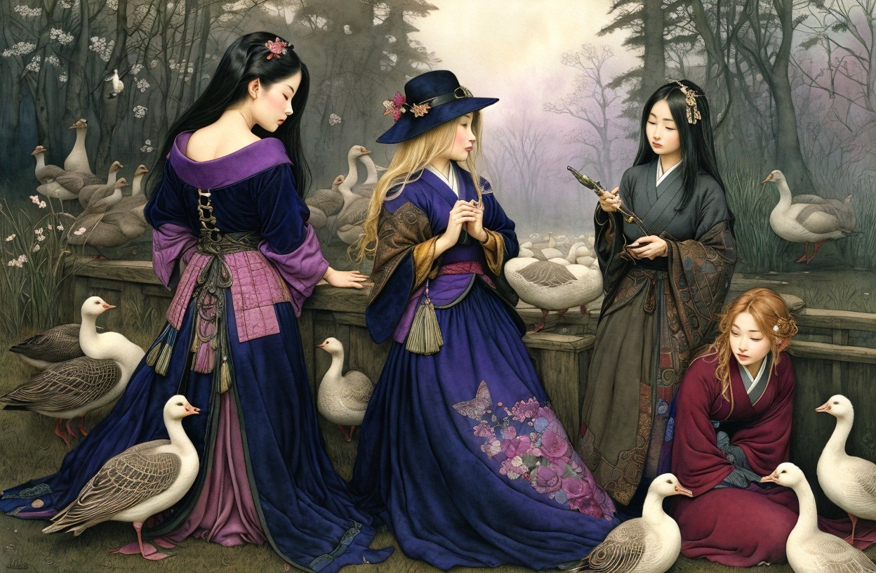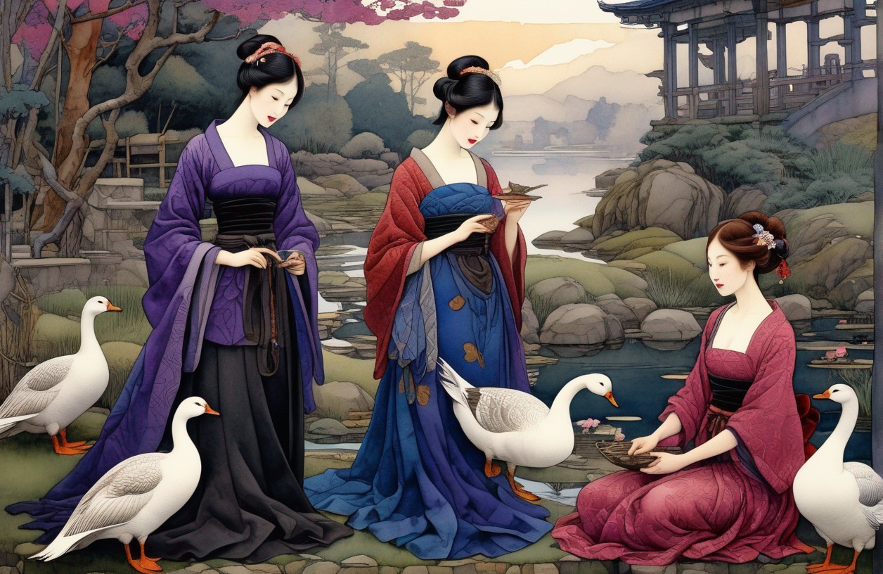 Beautiful women tending the geese. Medieval Japanese Artists Sumi-e Style, purple, indigo, Ruby red, Velvet Black, Shabby, Dull Gold, Amber Gray, Golden Ratio, Surreal Fantasy, Elegant, High Definition Ultra Fine 3D Line, Zenangle Style, Watercolor Patchwork , Arthur Rackham Style, Paul Kidby, , Jacek yerka, Extremely Detailed, Intricate, Thoughtful, HDR, Fractal, Beautiful, Award Winning, Fantasy Look, Fantasy, Crisp Quality