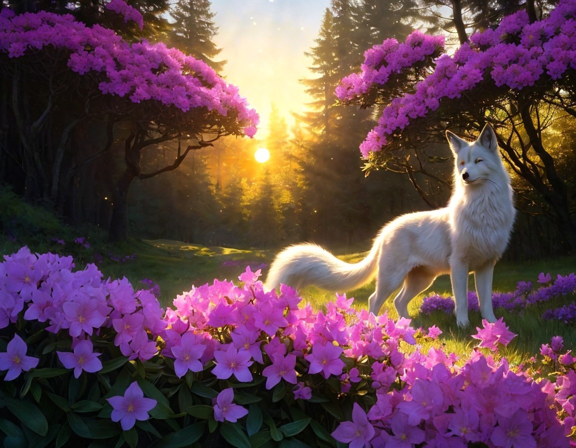 A graceful white fox stands among vibrant pink flowers in a serene forest setting. Sunlight filters through trees, creating a magical atmosphere filled with soft colors and tranquility.