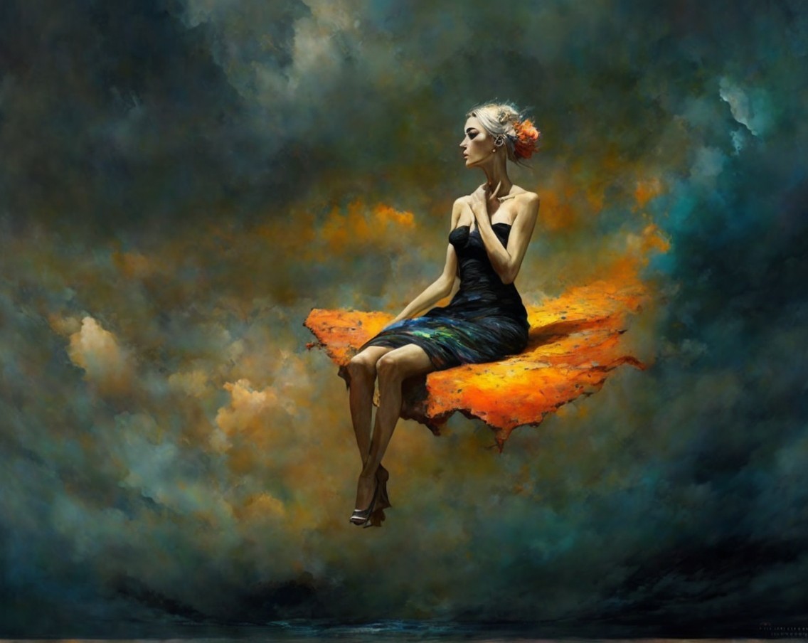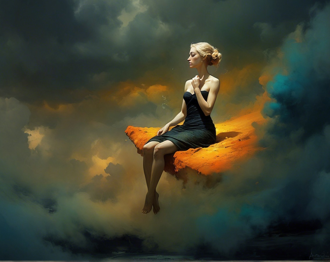 A serene figure sits on a floating cliff amidst dramatic clouds and vibrant hues. The ethereal scene blends fantasy and tranquility, evoking a sense of contemplation and wonder.