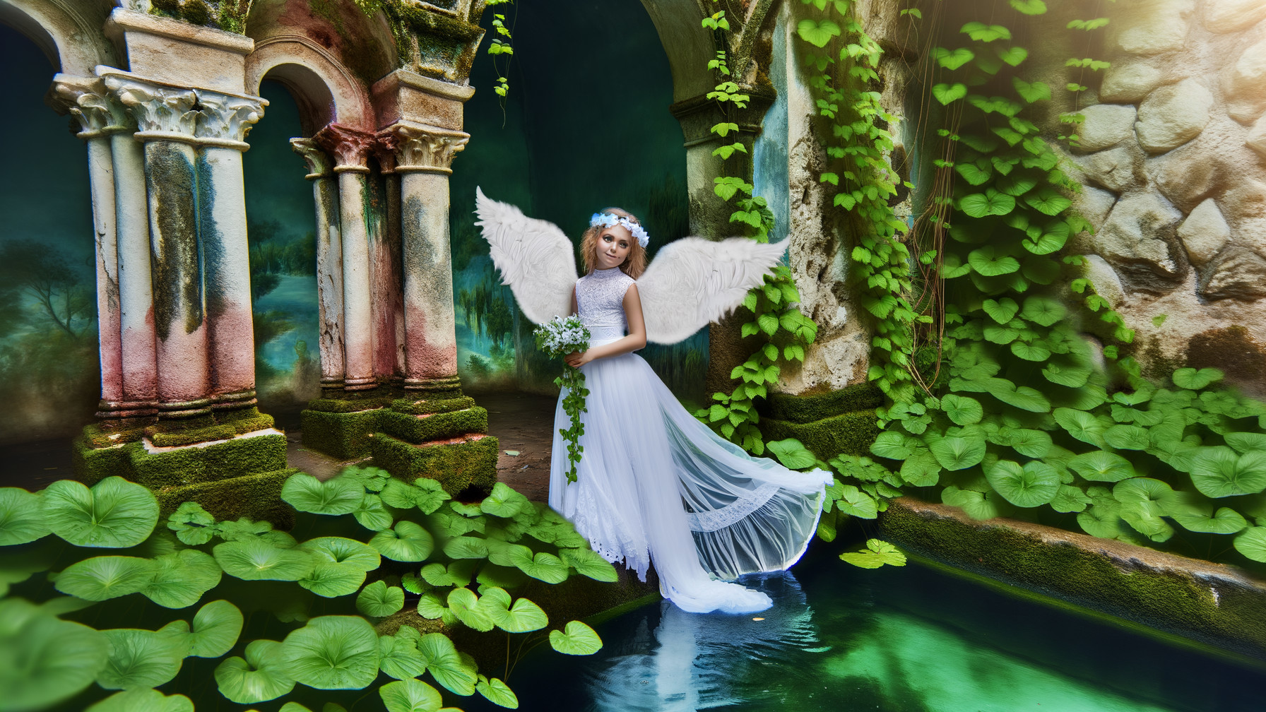 A serene scene of a mystical figure with large white wings, standing gracefully in a lush, overgrown garden. She wears a flowing, sheer gown and holds a small bouquet, surrounded by ancient ruins.