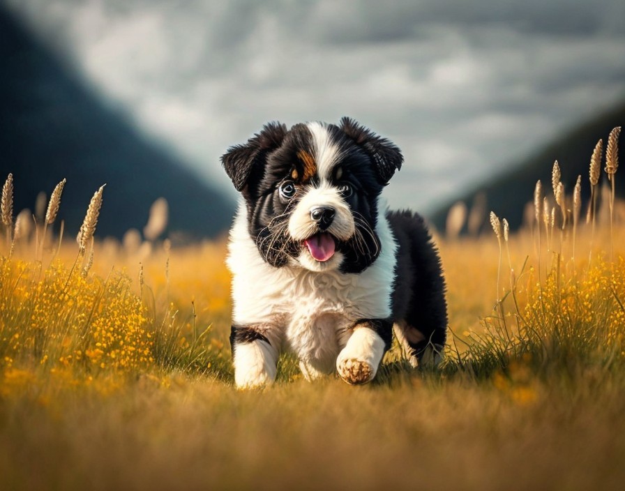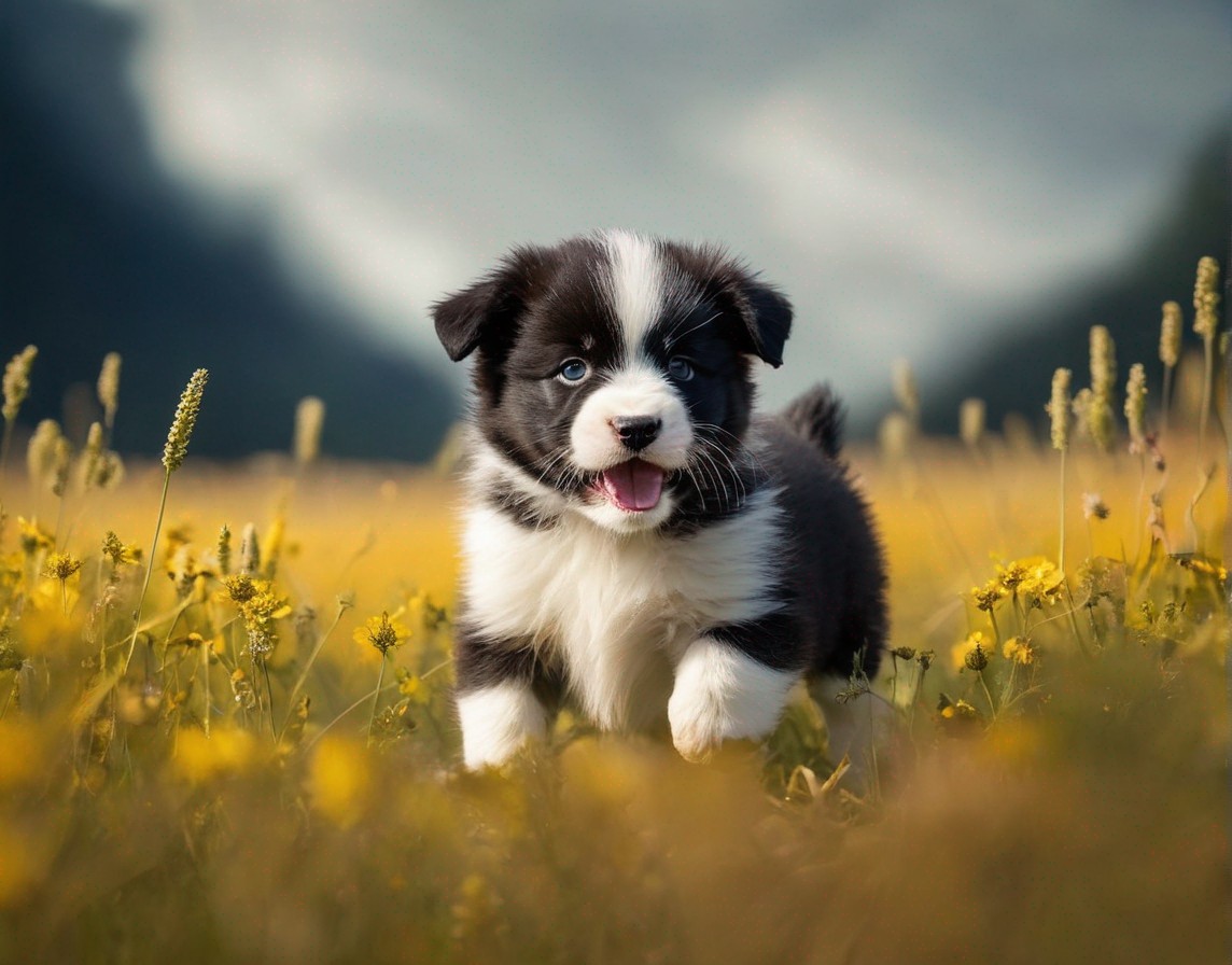 Blue-eyed Border Collie puppy in field with yellow flowers