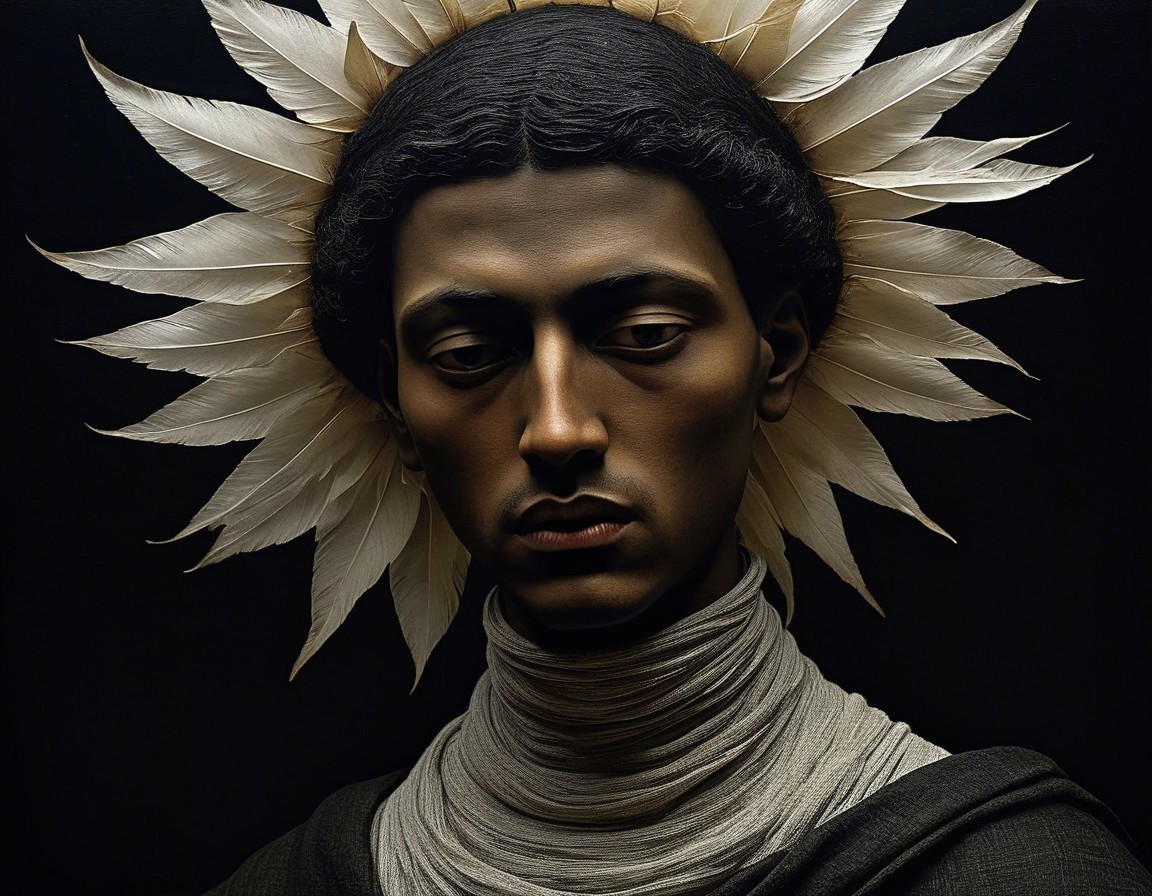 The image features a stylized portrait of a man with striking large eyes and a serious expression, surrounded by a glowing golden halo against a dark background with celestial motifs.