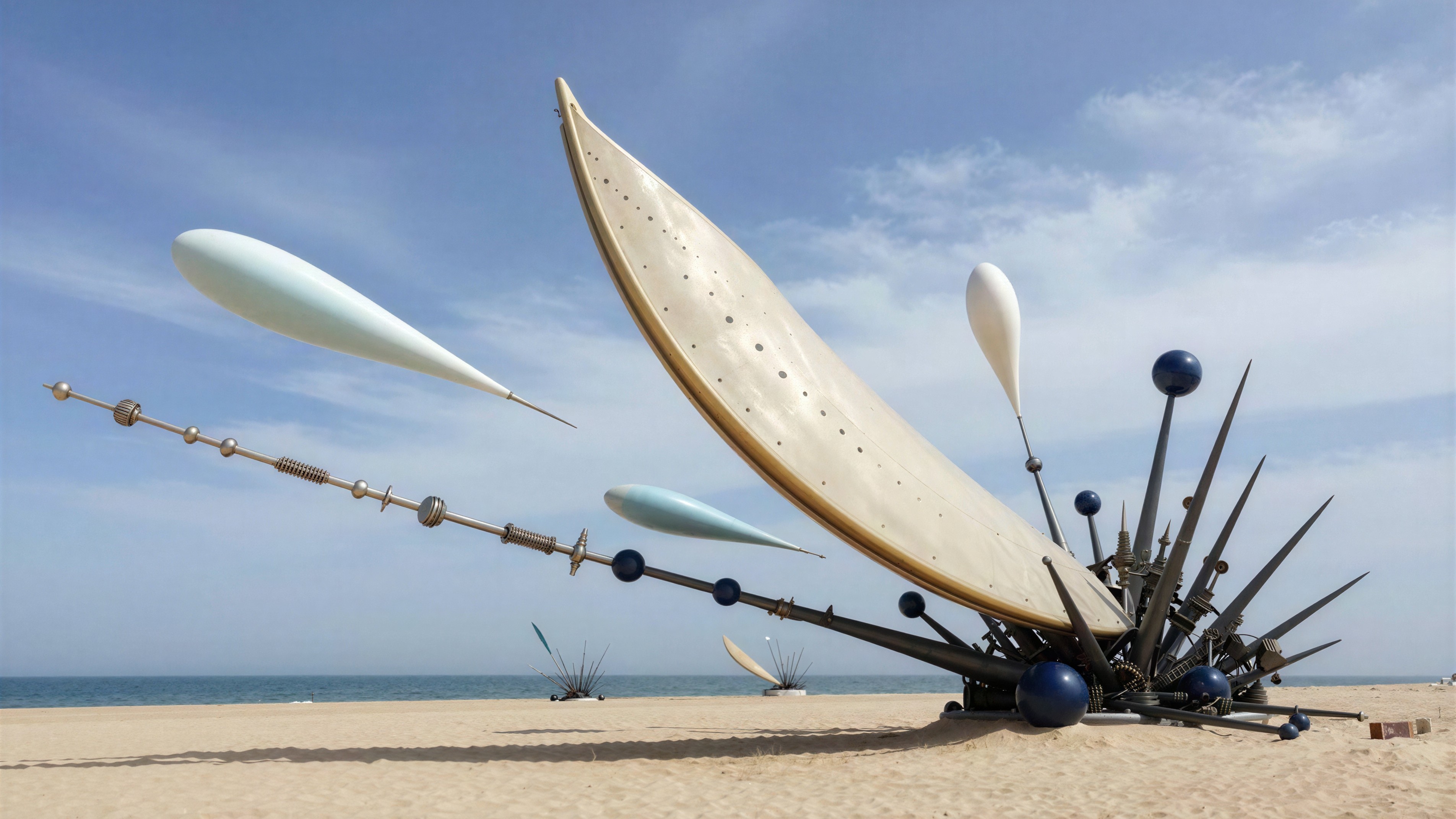 A sculpture of a large sailboat on the beach, with many spikes and strange objects. The sculpture includes an expansive golden satellite dish with small black indentations throughout. Above it, a white pod-like shape with a pointy end floats in the air. To the left, a long rod extends diagonally upwards