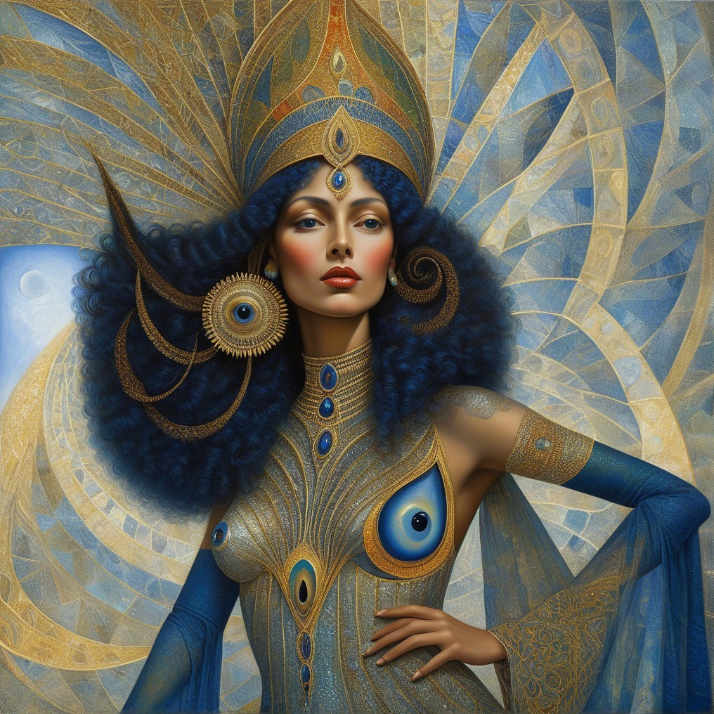 A single image, psychedelic siren, style of Alex Grey, style of Remedios Varo, style of Paul Klee, style of Leonora Carrington, eye contact, soft, beautiful delicate interplay of light and shadows on every surface, exotic, vivid, radiant, kaleidoscopic, highly colorful, most complex and highly intricate, dominant golden and indigo but colors, highly intricate and utterly complex designs and patterns, exciting. Prompt by Vishrut Abhinna.