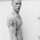 A stylish man stands in a desert landscape, wearing a light button-up shirt, a tie, and a unique hat. The photo is in black and white, highlighting his serious expression and the arid scenery.