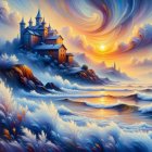 A majestic castle perched atop a rocky cliff overlooks a picturesque beach. Waves gently lap at the shore, while a vibrant sunset casts warm colors across the sky and water.