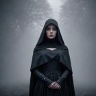A mysterious figure stands in a foggy forest, clad in a dark cloak and dress. Her intense gaze pierces the mist, creating an eerie and haunting atmosphere around her.