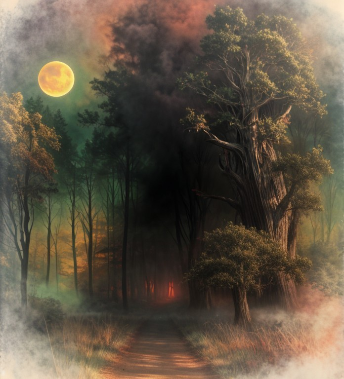 A mysterious forest path leads into shadowy trees, illuminated by a haunting full moon. The atmosphere is eerie and full of horror.