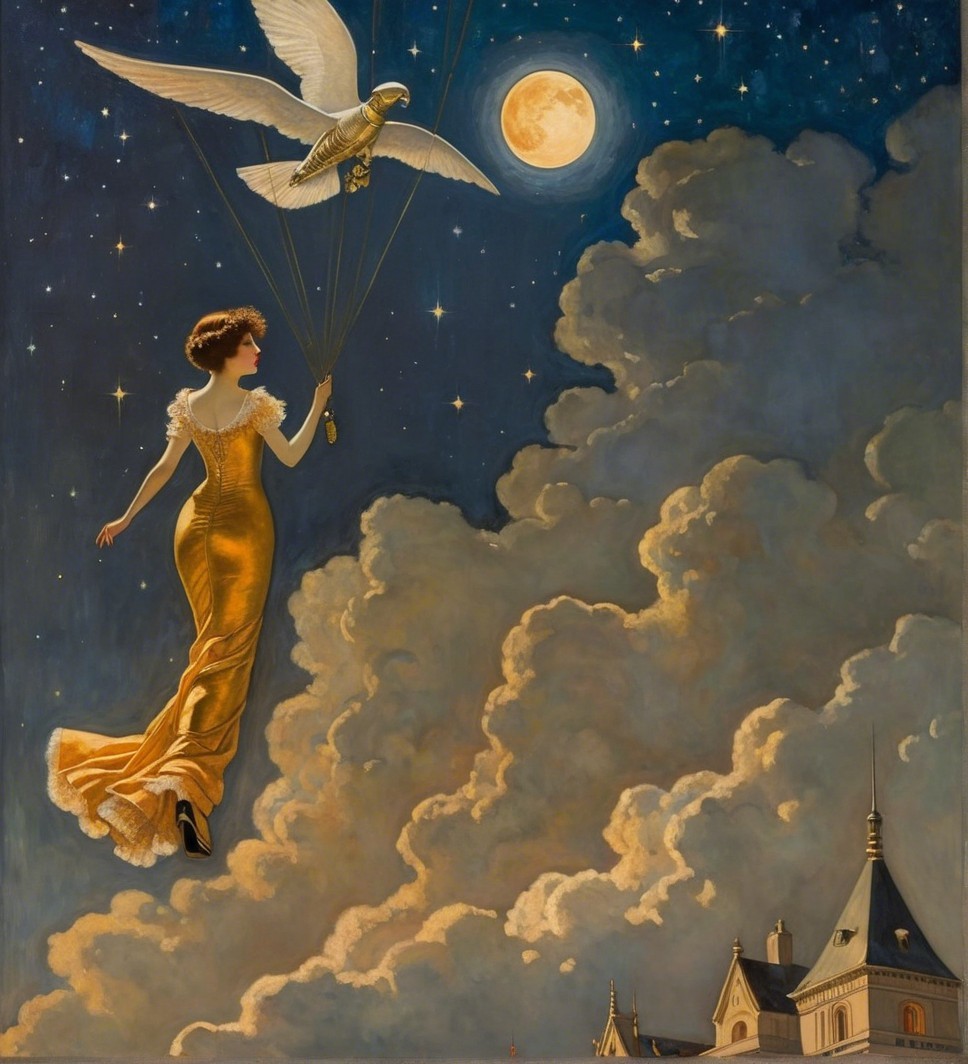 A glamorous woman in a golden gown stands poised on a rocky ledge, holding a pistol. Above her, a celestial figure hovers near a glowing moon, surrounded by dramatic clouds and starry skies.