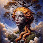A surreal portrait of a woman with tree-like hair, set against a starry sky. Intricate patterns intertwine her features, symbolizing nature and interconnectedness in a vibrant landscape.