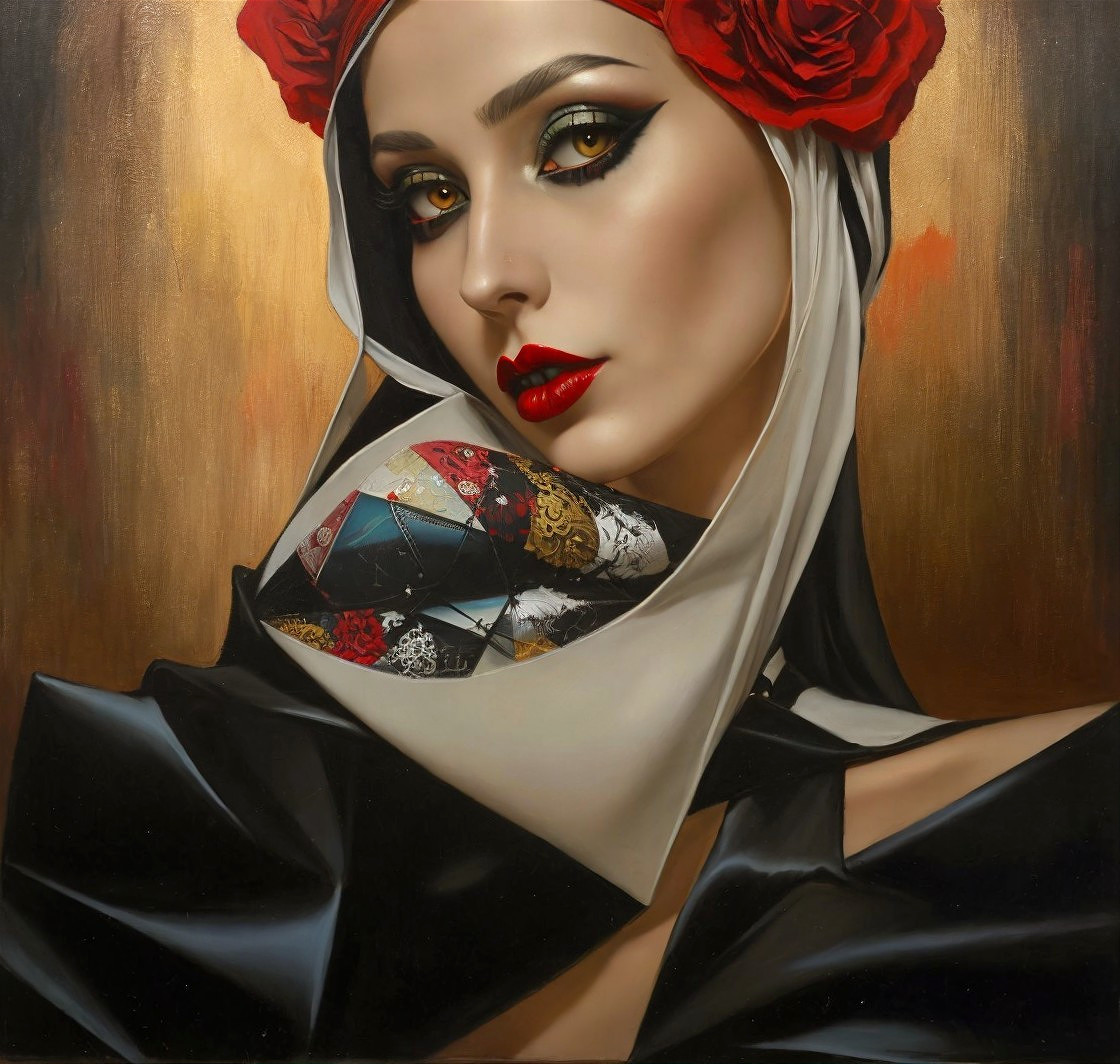 A sophisticated portrait painting of a woman in a black and white habit, with vibrant red lipstick. The woman has dark hair adorned with red roses and striking amber eyes, framed by dramatic black winged eyeliner and green eyeshadow. Her skin has a soft glow with subtle blush. Inside the white collar of her habit