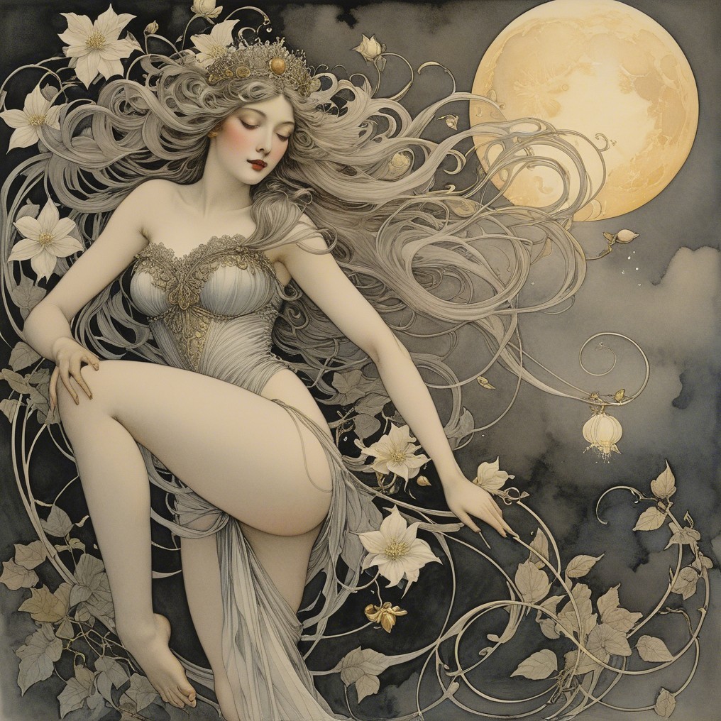 A graceful woman with flowing hair adorned with flowers dances amidst a starry night. She wears a soft blue gown, surrounded by delicate blossoms and a glowing full moon.