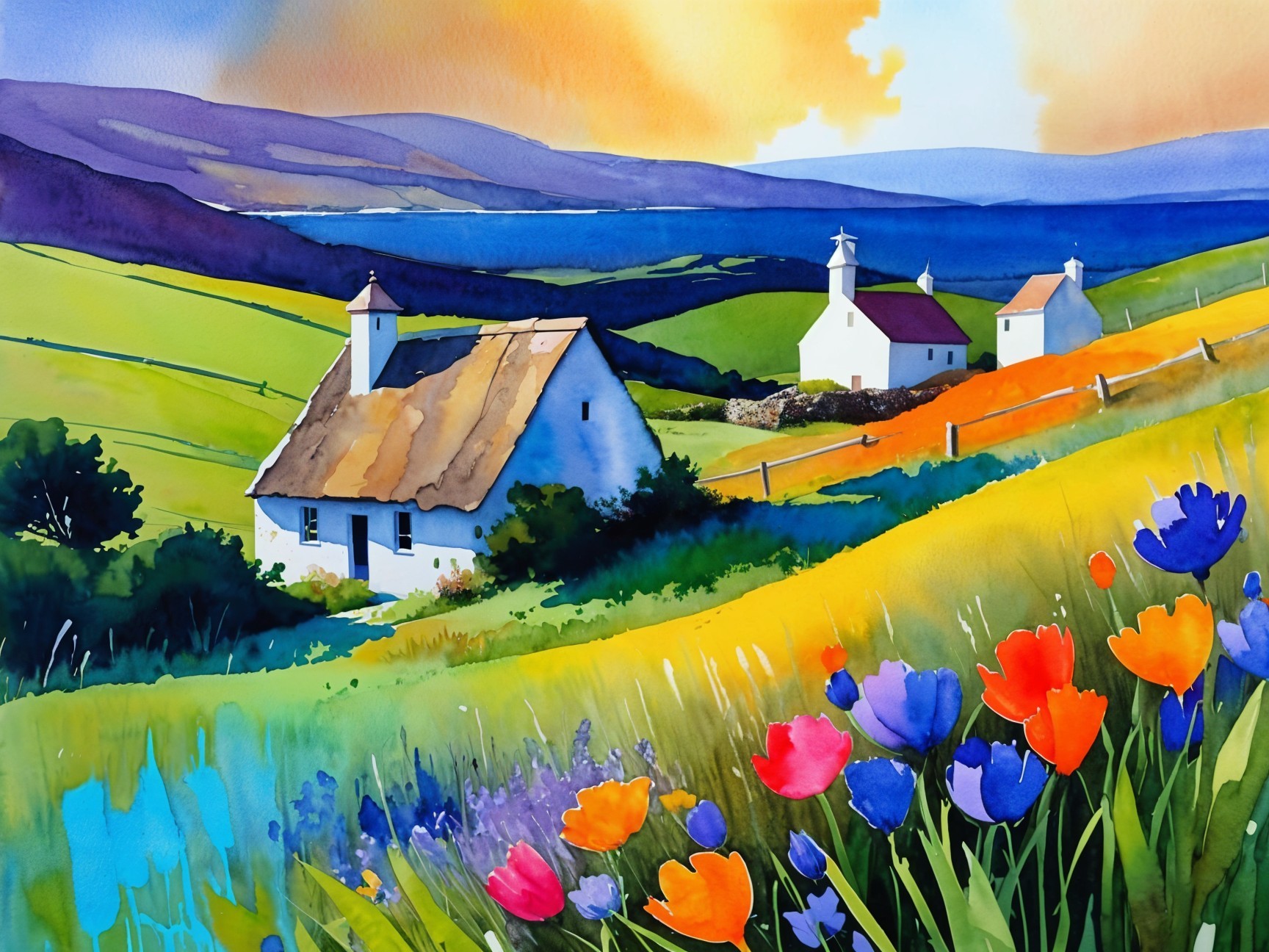 A vibrant watercolor landscape featuring quaint cottages with orange roofs, surrounded by colorful flowers. A tranquil sea and rolling hills create a serene, idyllic setting. Prompt by Richard Murch. Thanks!