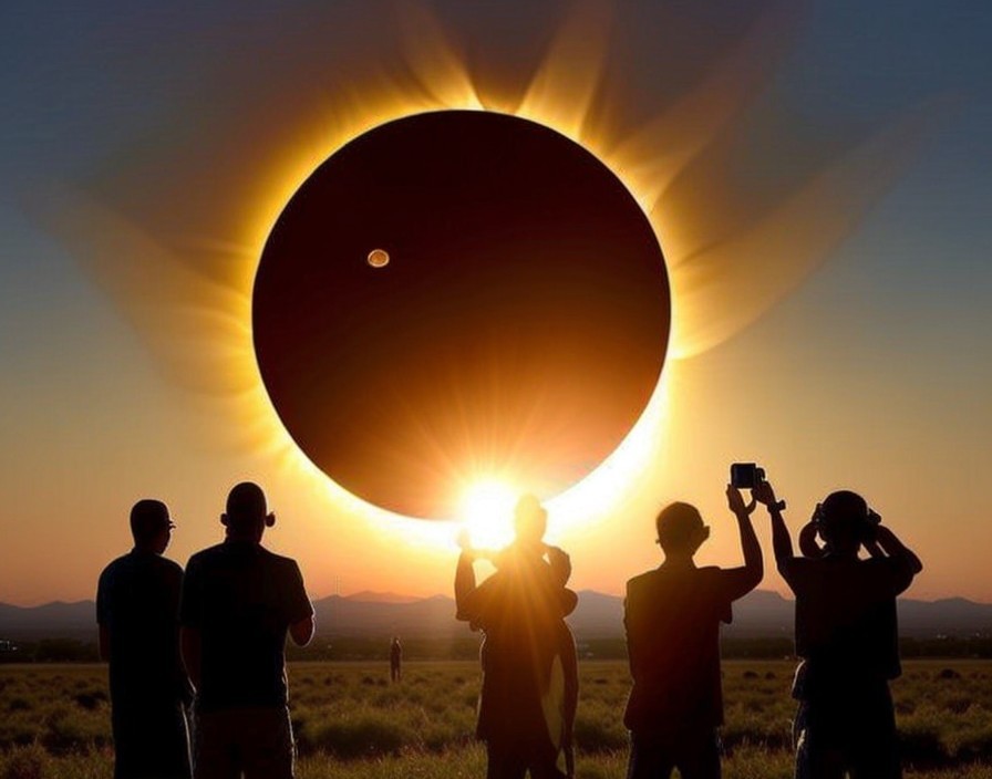Four people stand in silhouette against a stunning solar eclipse, with a sunburst effect creating a dramatic backdrop of mountains and vibrant fields blooming with flowers.