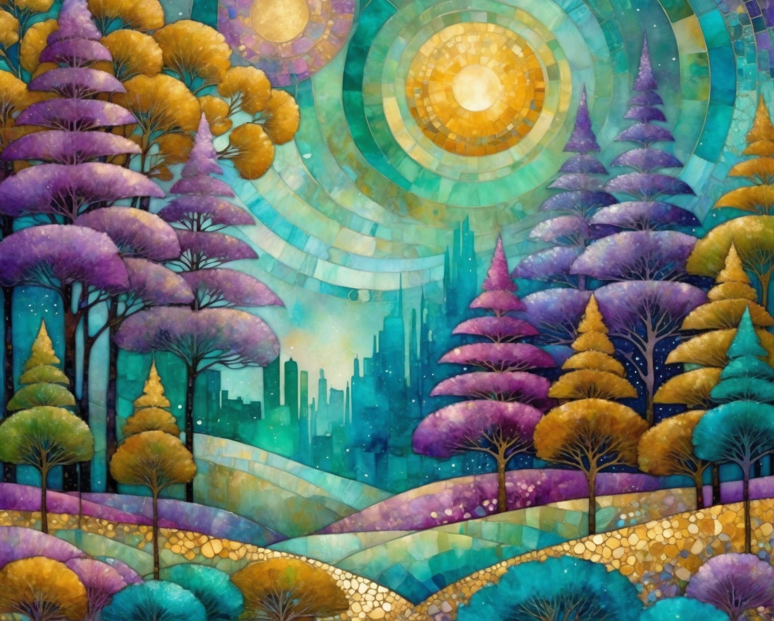 An abstract, highly detailed, vibrant, and colorful stained glass mosaic watercolor painting of a fantastical landscape with a bright golden sun against a light blue, green, and purple sky. The foreground and midground feature numerous stylized trees with round tops and tall, thin trunks, colored in shades of purple, dark